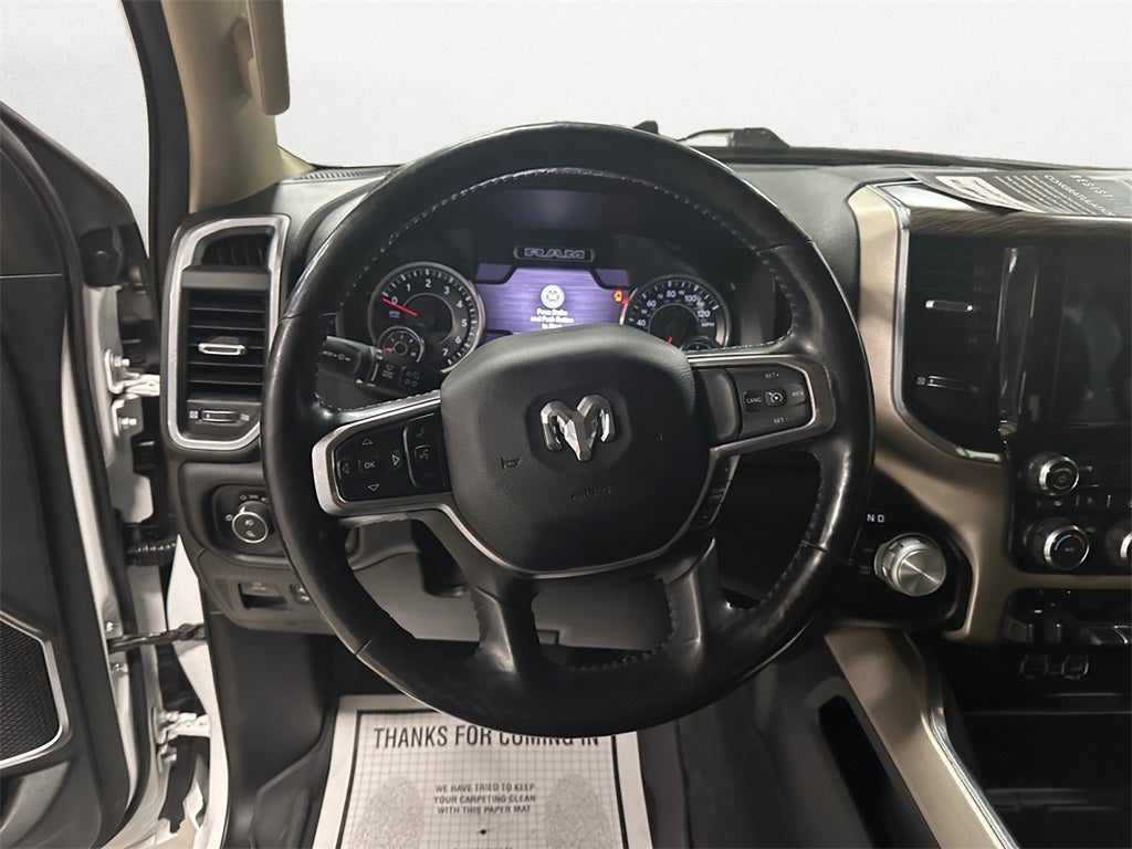 2020 Ram 1500 Laramie This 2020 Ram 1500 Laramie in Ivory White Tri-Coat Pearlcoat features. #1 Seat Foam Cushion, 3.21 Rear Axle Ratio, 4-Wheel Disc Brakes, 4G LTE Wi-Fi Hot Spot, 8.4 Touchscreen Display, ABS brakes, Anti-Spin Differential Rear Axle, Apple CarPlay/Android Auto, Auto High Beam Headlamp Control, Blind Spot & Cross Path Detection, Dual front impact airbags, Dual front side impact airbags, Electronic Stability Control, Foam Bottle Insert (Door Trim Panel), Front wheel independent suspension, Fully automatic headlights, GPS Navigation, Heated Front Seats, Heated front seats, Heated Steering Wheel, Laramie Level 1 Equipment Group, Leather steering wheel, Leather Trim 40/20/40 Bench Seat, ParkSense Front/Rear Park Assist w/Stop, ParkView Rear Back-Up Camera, Power 8-Way Driver & Passenger Seats, Quick Order Package 25H Laramie, Rain Sensitive Windshield Wipers, Rear 60/40 Folding Split Recline Seat, Remote Tailgate Release, Tailgate Ajar Warning Lamp, Wheels: 20 x 9 Premium Paint/Polished.